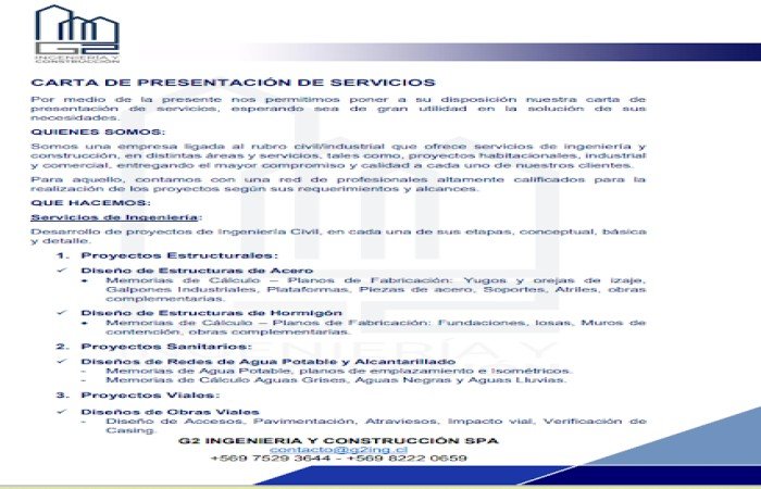 En G2 INGENIERIA Y CONSTRUCCIÓN SPA, nos enorgullece ofrecer una amplia gama de servicios dentro del sector de la Empresa de Ingeniería Civil. Con una ubicación privilegiada en Antofagasta, Chile, en Cap. Carlos Condell 2919, nos hemos consolidado como un proveedor líder, impulsado por la innovación y un compromiso inquebrantable con la excelencia. Nos especializamos en el diseño, la ejecución y el supervisión de proyectos de ingeniería civil que abarcan desde infraestructura básica hasta construcción industrial compleja. Nuestra experiencia abarca la planificación detallada, la gestión de recursos, la supervisión rigurosa y la utilización de las últimas tecnologías para asegurar que cada proyecto se entregue a tiempo, dentro del presupuesto y cumpliendo con los más altos estándares de calidad y seguridad. En G2 INGENIERIA Y CONSTRUCCIÓN SPA, valoramos la colaboración y construimos relaciones a largo plazo con nuestros clientes. Estamos comprometidos a entender sus necesidades específicas y a ofrecer soluciones personalizadas que impulsen el éxito de sus proyectos. Confíe en G2 INGENIERIA Y CONSTRUCCIÓN SPA para transformar sus ideas en realidad. Contáctenos hoy mismo y descubra la diferencia G2.